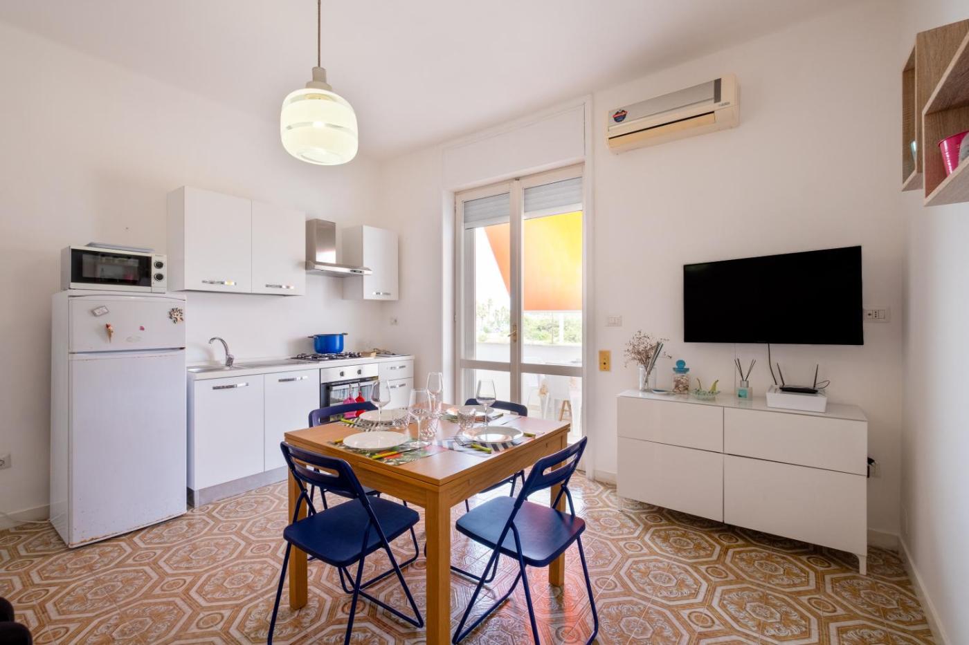 Questa casa vacanze prevede 2 camere da letto, 1 bagno, lenzuola, asciugamani, una TV, una cucina con utensili e un balcone con la vista sul mare.